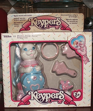 Les keypers étaient des animaux / boîtes à secret spécialement pour les filles. Rose, paillettes et cheveux à coiffer, bref un vrai truc de filles qui faisaient leur bonheur. Ils étaient déclinés sous plusieurs formes : des lapins, des escargots, des chats, des chiens, des chevaux…